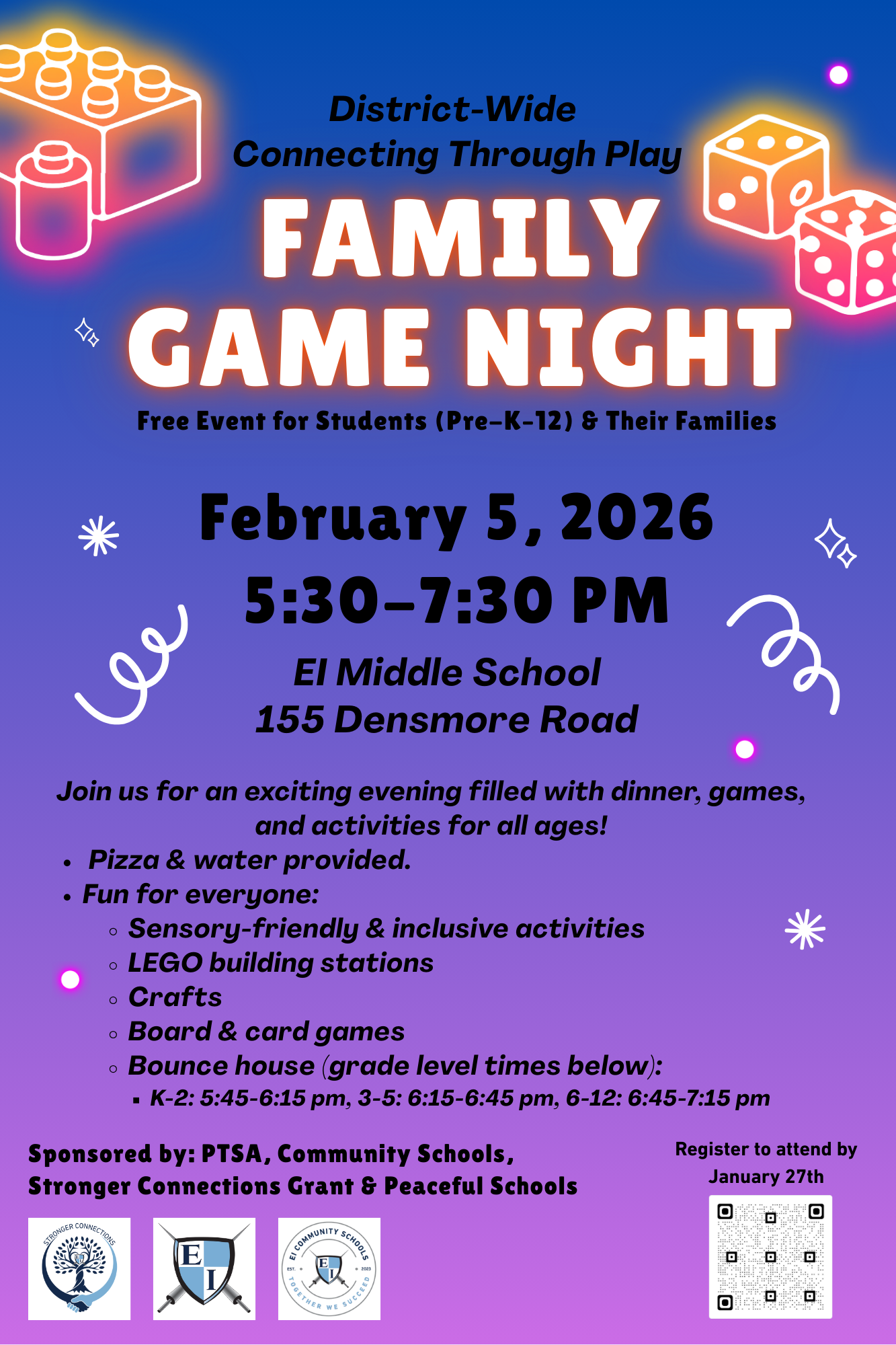 Looking ahead to February, we invite all families across the district to join us for Family Game Night on February 5, from 5:30–7:30 PM at EI Middle School. This free, district‑wide event brings everyone together for a fun evening of pizza, games, crafts, LEGO stations, sensory‑friendly activities, and even a bounce house with scheduled times by grade level. It’s a perfect way to play, explore, and enjoy time together. Families are encouraged to register by January 27.