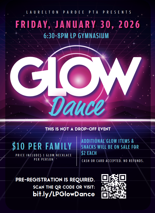 Later this month, our PTA will be hosting a bright and joyful evening at the Glow Dance on Friday, January 30, from 6:30–8:00 PM in the LP Gym. Families can attend together for $10, which includes a glow necklace for each person. Additional glow items and snacks will be available for purchase, and preregistration is required. This event is always a favorite, and we hope to see many families lighting up the night! Keep scrolling to see registration info.
